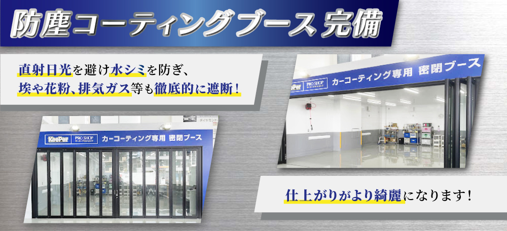 また、当店はキーパープロショップの中でも最新設備を完備しております!屋根付きのコーティング場も新設しましたので、天候に左右されずコーティングを施工することが可能です!